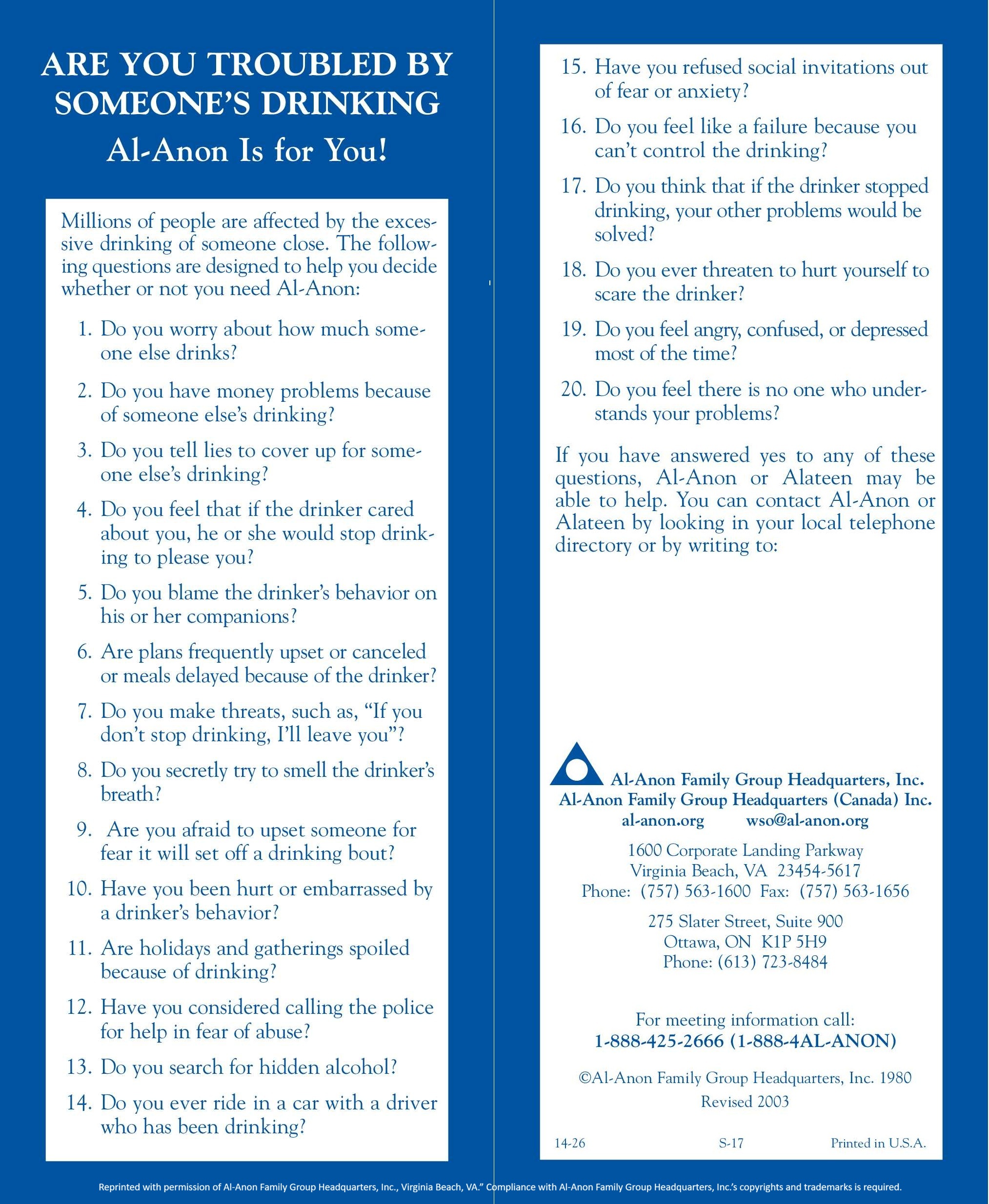We can find understanding and support when we share our common experience with each other. Some of us are here because a spouse or partner has struggled with alcoholism. For others, the problem drinker is a parent, child, or grandchild. Sometimes a brother, a sister, or some other friend or relative brings us to Al-Anon. Many of us have had more than one alcoholic family member or friend.